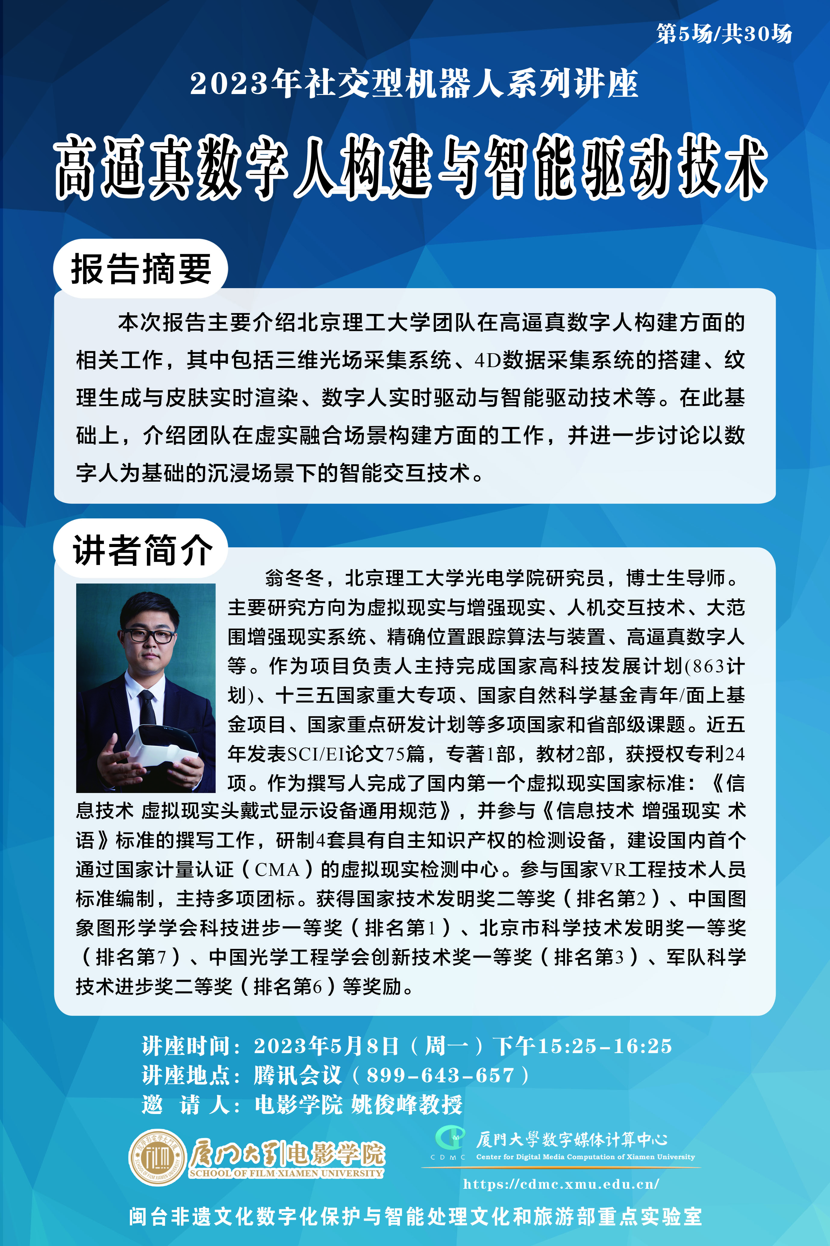本次报告主要介绍北京理工大学团队在高逼真数字人构建方面的相关工作,其中包括三维光场采集系统、4D数据采集系统的搭建、纹理生成与皮肤实时渲染、数字人实时驱动与智能驱动技术等。在此基础上,介绍团队在虚实融合场景构建方面的工作,并进一步讨论以数字人为基础的沉浸场景下的智能交互技术。