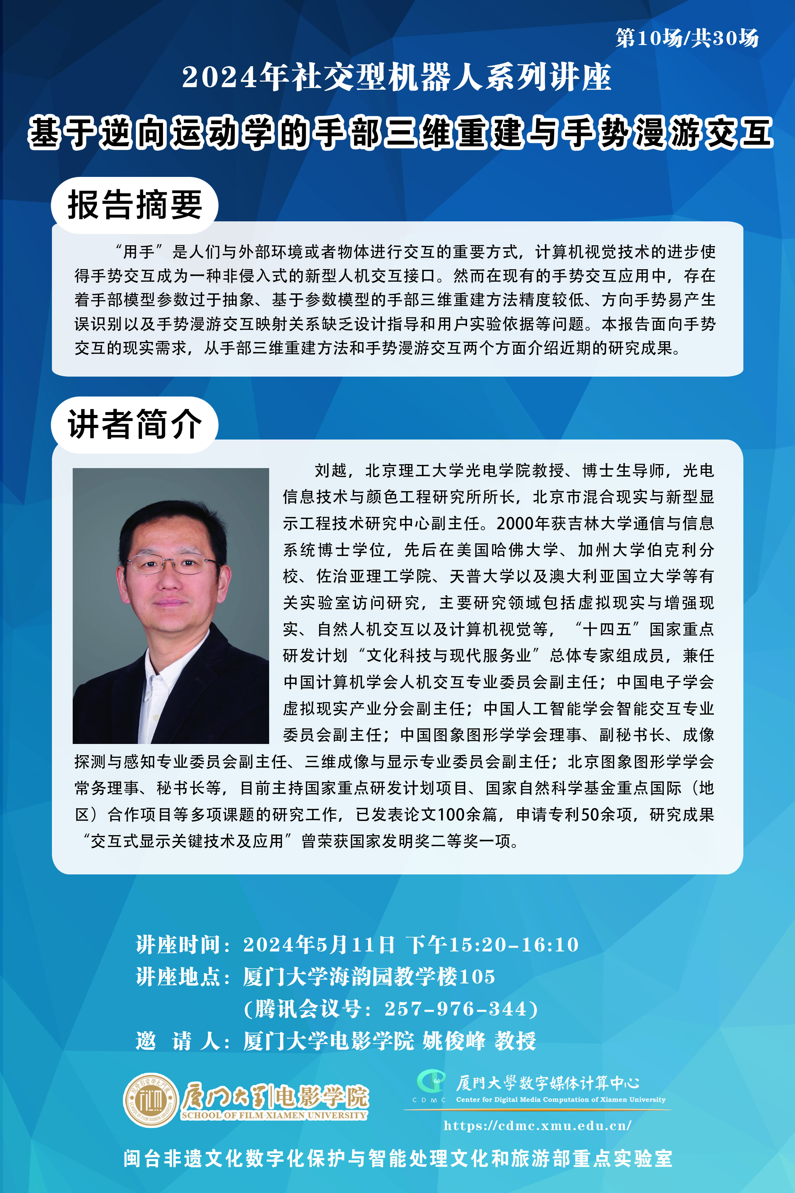 刘越,北京理工大学光电学院教授、博士生导师,光电信息技术与颜色工程研究所所长,北京市混合现实与新型显示工程技术研究中心副主任。2000年获吉林大学通信与信息系统博士学位,先后在美国哈佛大学、加州大学伯克利分校、佐治亚理工学院、天普大学以及澳大利亚国立大学等有关实验室访问研究,主要研究领域包括虚拟现实与增强现实、自然人机交互以及计算机视觉等,“十四五”国家重点研发计划“文化科技与现代服务业”总体专家组成员,兼任中国计算机学会人机交互专业委员会副主任;中国电子学会虚拟现实产业分会副主任;中国人工智能学会智能交互专业委员会副主任;中国图象图形学学会理事、副秘书长、成像探测与感知专业委员会副主任、三维成像与显示专业委员会副主任;北京图象图形学学会常务理事、秘书长等,目前主持国家重点研发计划项目、国家自然科学基金重点国际(地区)合作项目等多项课题的研究工作,已发表论文100余篇,申请专利50余项,研究成果“交互式显示关键技术及应用”曾荣获国家发明奖二等奖一项。